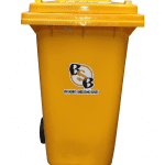 Design: Full-sized yellow wheelie bin with a reinforced base.